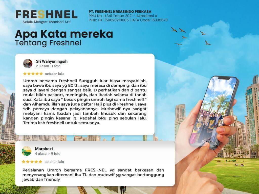 - Mendapatkan pengembalian dana setelah dikurangi biaya pendaftaran dan biaya lain yang sudah dikeluarkan oleh PT. Freshnel Kreasindo Perkasa, atau melimpahkan keberangkatan kepada ahli waris lainnya jika calon jamaah meninggal dunia atau mengalami cacat/sakit permanen yang menyebabkan tidak bisa berangkat umroh ke tanah suci.