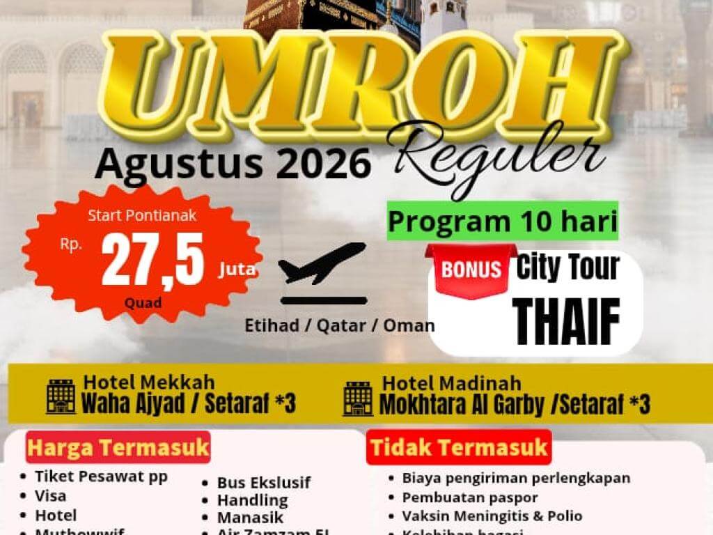 - Perlengkapan Umroh (Koper 24", Tas Selempang, Syal, Bahan Batik, Kain Ihrom (Laki-laki), Mukenah, Buku Doa & Panduan Manasik)