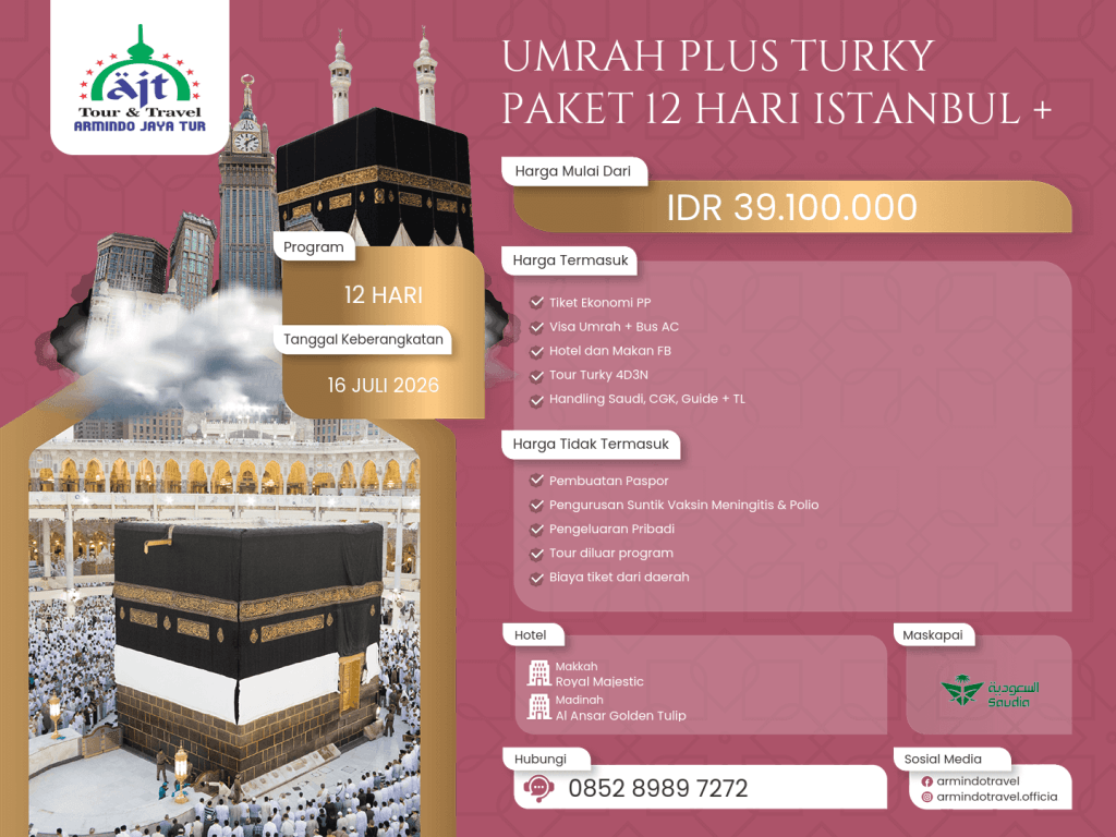 UMRAH HEMAT BERKAH 10 AGUSTUS 2026 PROGRAM 12 HARI ARMINDO JAYA TUR